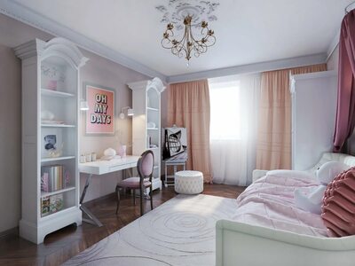 Очаровательная комната дочери с яркими акцентами и уютной обстановкой. Здесь царит атмосфера радости и вдохновения.